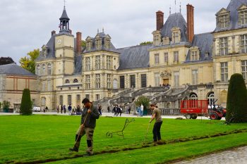庭師(ジャルディニエ)たちが芝生の端をカットする作業中です。