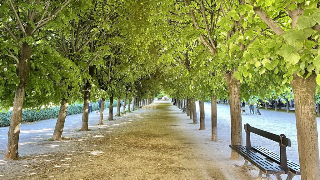 セイヨウシナノキの並木道の所々にベンチが設置され、