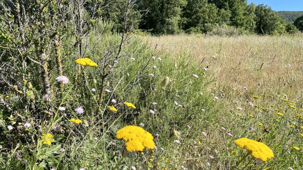 そしてポタジェを囲むように揺れる野の花たち。ドライフラワーにもしている様子。少しでも花らしい花があると、これがまた心楽しい風景になります。ポタジェ(菜園)には、少し花を入れるのがいいなあ。もちろん野菜の花も咲くけれども、さらに花が混じってると、「野菜畑」というより「ポタジェ」っぽい雰囲気になる気がします(独自基準(笑))。
