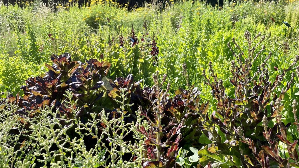 入口近くに多年草のエリア、野菜エリアなどの栽培コーナーがあり、サラダ菜などはすでに種子がどんどん上がって来ています。