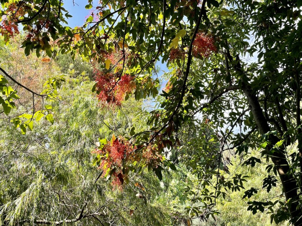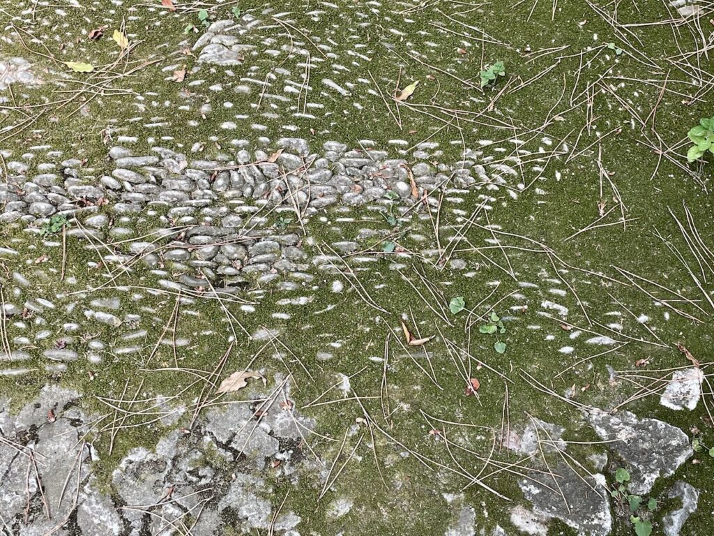 中心軸の通った端正の左右対象の構成。ここでは上から被さる葉っぱでよく見えないですが、上の方、奥には母屋の建物が見えてきます。