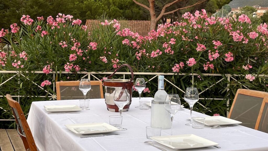 例えば、こちらはコルシカ島の海の近くの友人宅テラス。テラスを囲むのは目隠しを兼ねたキョウチクトウの生垣です。ごくシンプルにピンクのキョウチクトウのみ、で、このように素敵な雰囲気のテラスに〜。