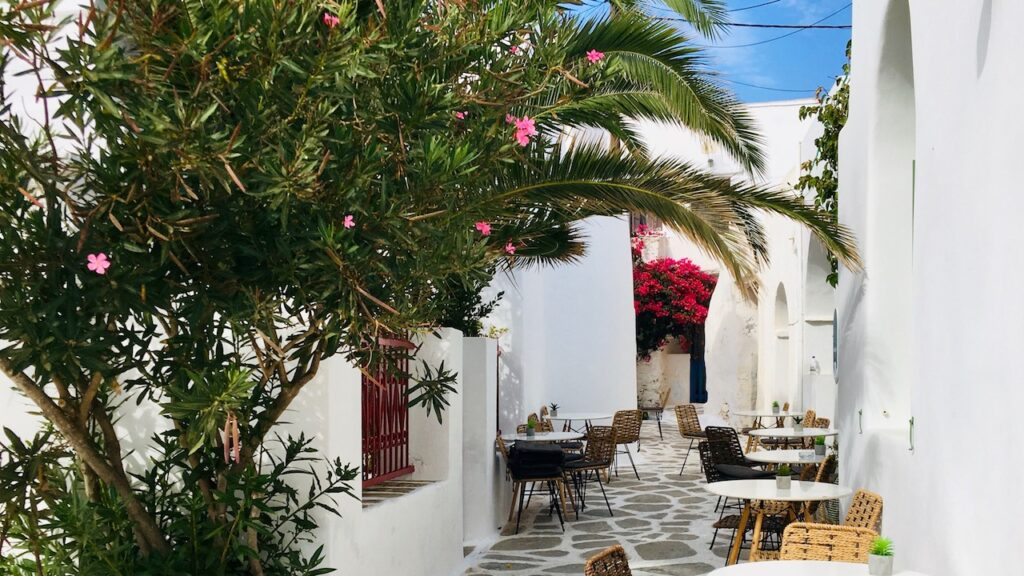 こちらは地中海つながりでギリシャの島の街のなかのカフェのテラス。ヤシの木と混じっているのはやはりキョウチクトウ。遠くにはブーゲンビリアがちら見えしています。(ちなみにブーゲンビリアも一気に南欧リゾートっぽさを演出する花のひとつかと思われます。)