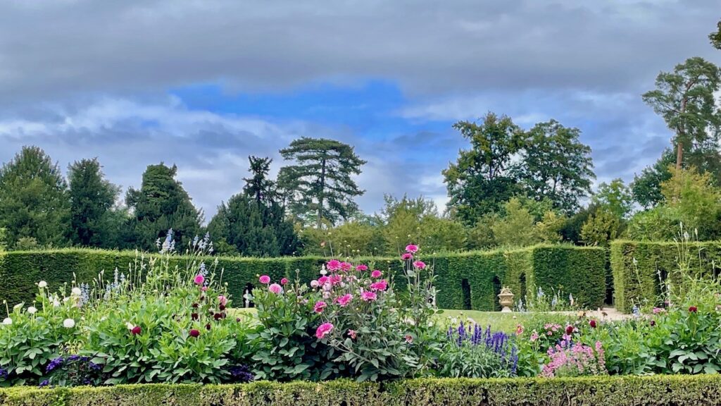 グラントリアノンの庭園の、さらに奥に進んでいけば、今度はクラッシックにダリアが盛りだくさんの花の植栽が待っています。さすがに全部アヴァンギャルドな植栽にしてしまうと、ちょっとクレームものになりそうですが、いい塩梅のバランスが取れています。そして、グリーン淡彩の後には、様々な品種のダリアの色彩が一層に引き立って見えてきます。