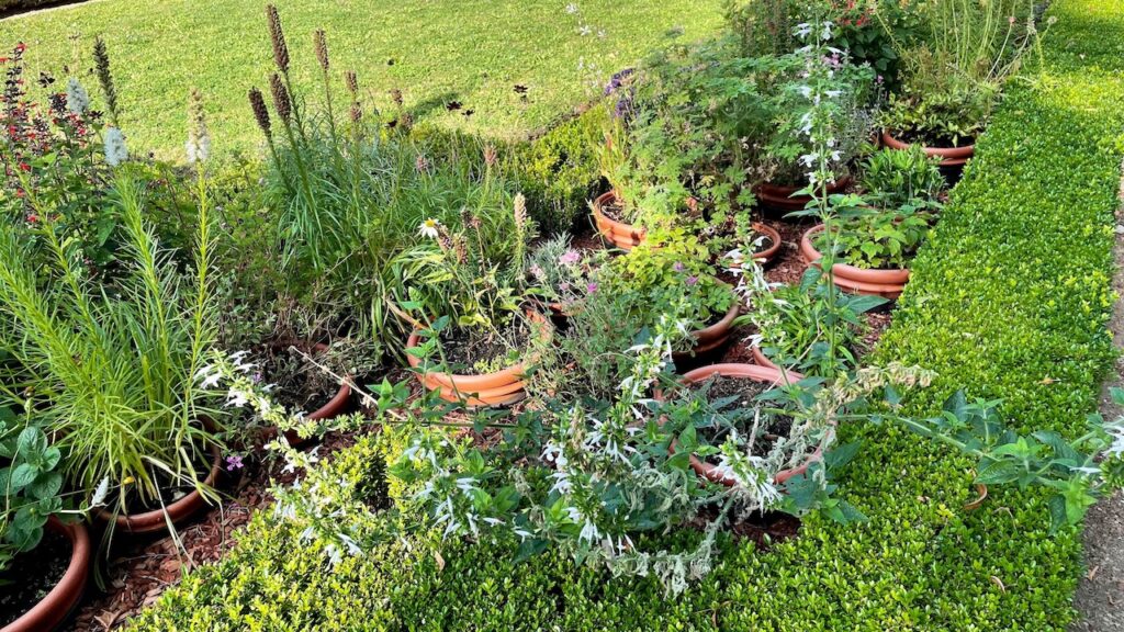ここでは、ルイ15世の時代(18世紀)にグラントリアノンの花の植栽で行われていたように、植木鉢仕立ての植物を配置してのアレンジが見られるのが興味深い。植木鉢の間はマルチングが埋めています。