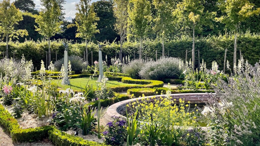 パビヨン・フレの前のやはりシンメトリーに丸い池を囲んだ花壇では、ラベンダーなどで夏らしい爽やかで明るい雰囲気の植栽が待っています。こちらは植木鉢ではなくちゃんと地植えになっていて、水の蒸発を抑えるためのマルチングが施されています。