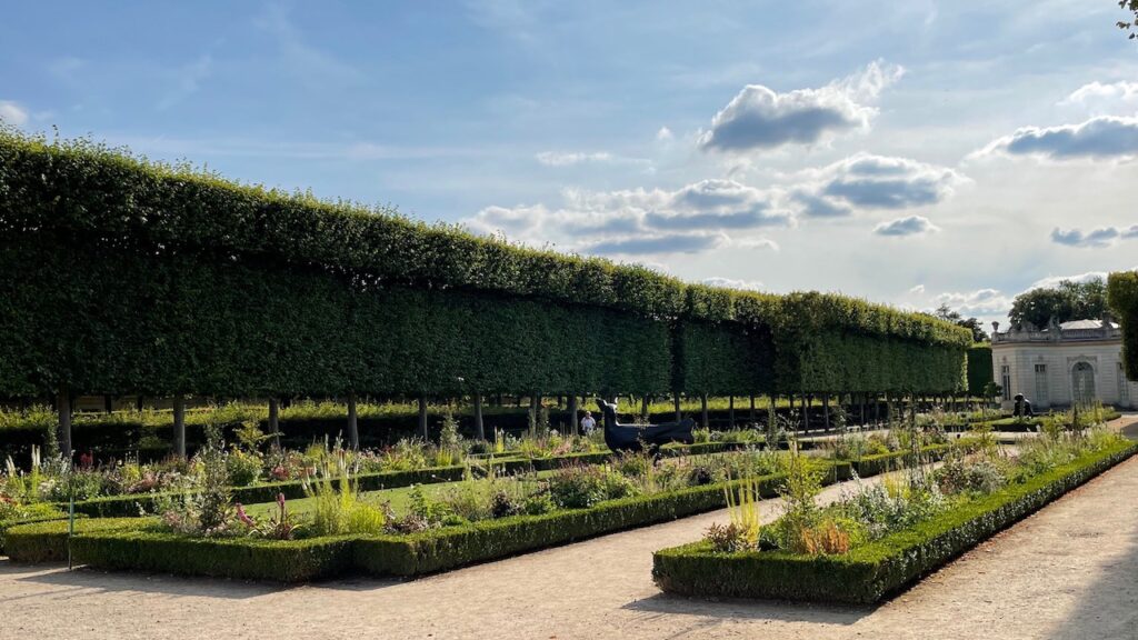 こちら右奥はパビヨン・フランセと呼ばれる東屋。ルイ15世がポンパドゥール夫人のために作らせた東屋でしたが、デュバリー夫人ののち、マリー・アントワネットが引き継ぎ、ここでパーティー三昧を楽しんだとか。整然とした空間の中で、ちょっと注目したいのはこの植栽部分。