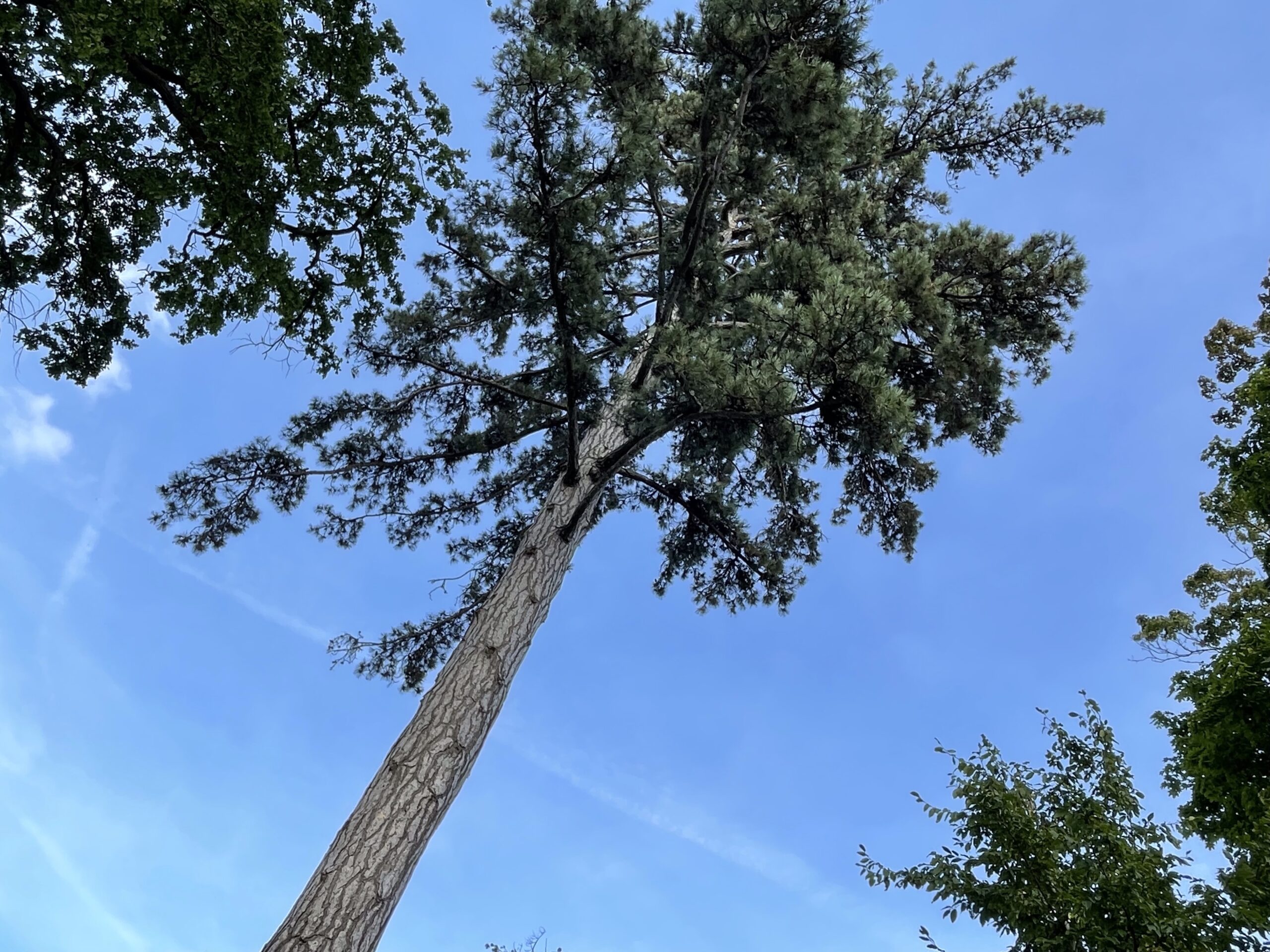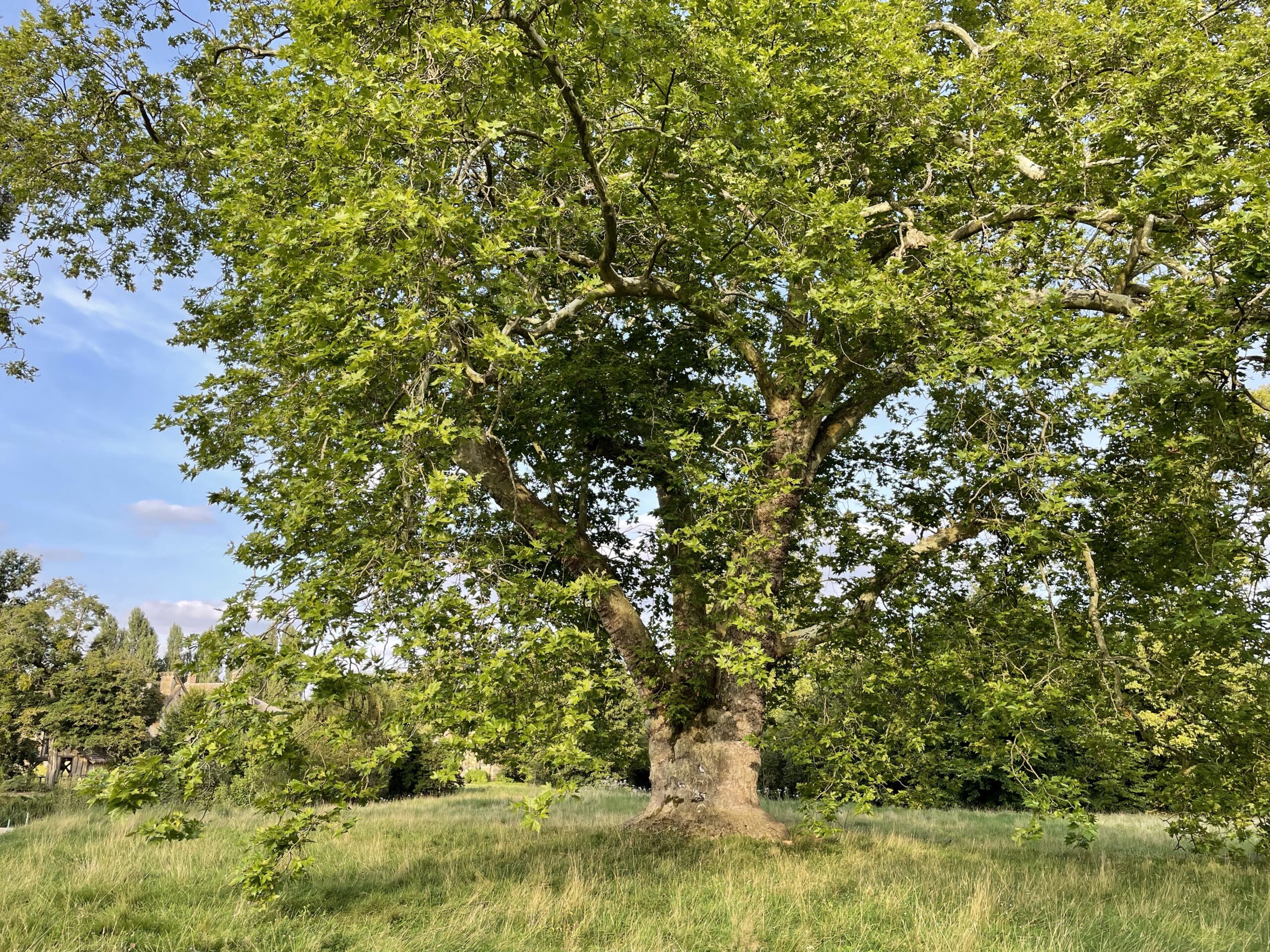 ひょろっとした針葉樹が続いたので、もうひとつ雰囲気の違う感じの「象の足」というあだ名がついたズッシリとしたプラタナス(モミジバスズカケノキ)の木を見てみる。幹回りは7m程あり、確かに象の足みたいな外観である。古くは古代ギリシャ時代から好んで並木などに使われて来たのだそうだ。