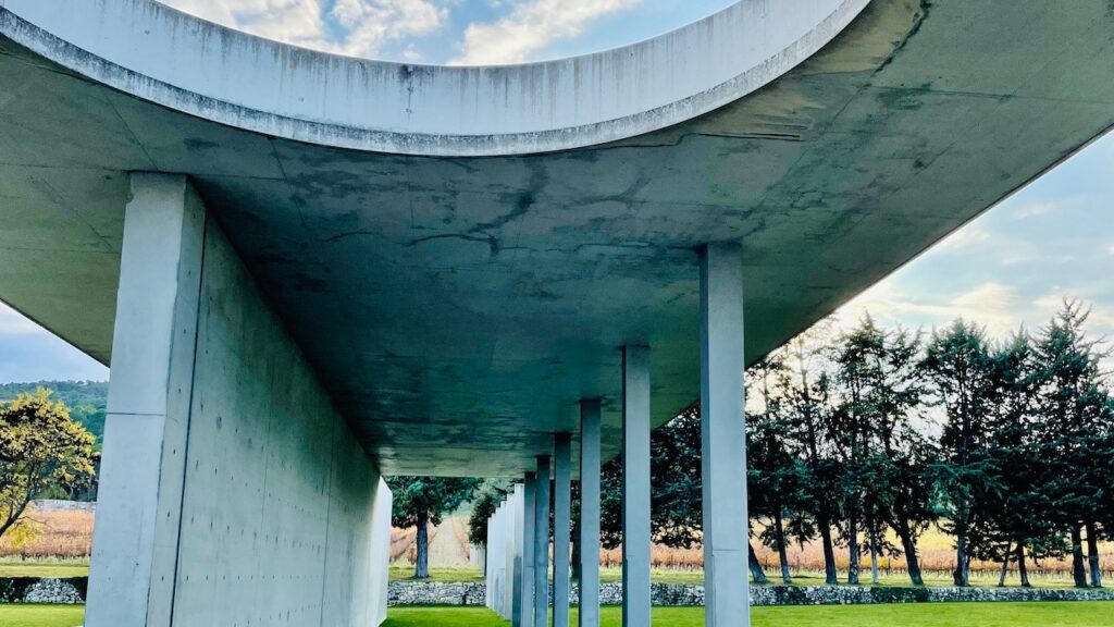アートセンターの回廊、天井の空に開いた楕円のドームは直島のホテルを思い出させるけれども、その奥に広がるのは、まさにプロヴァンスの風景の一場面、延々と続くブドウ畑。