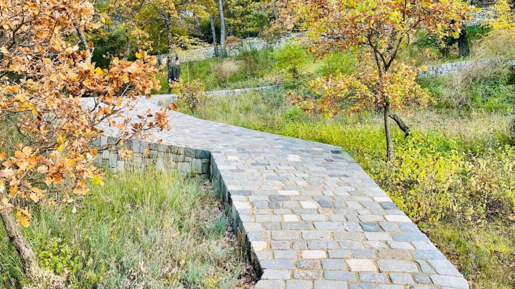 例えば、これは通路に見えるかもしれないのですが、実は2年がかりで制作された、艾 未未(アイ・ウェイウェイの彫刻・建築作品。緩やかな傾斜に沿って作られたこの現代の通路は、上方の古代ローマ街道の石積みの壁の道に繋がります。