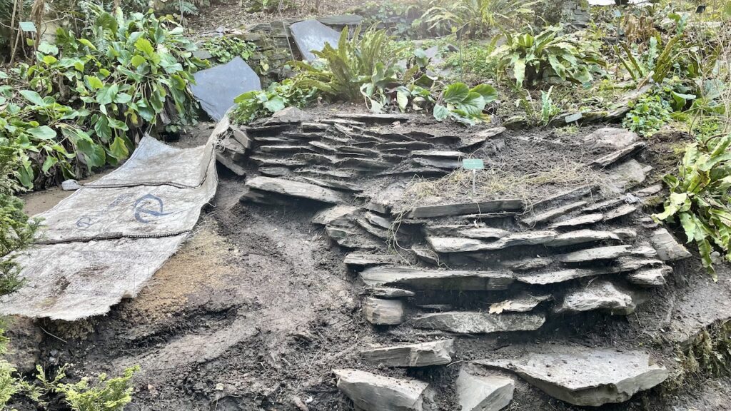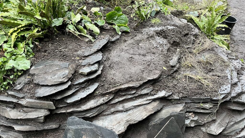 崩れかかっていたスレート板を組んだ植込みの一部を組み直して、