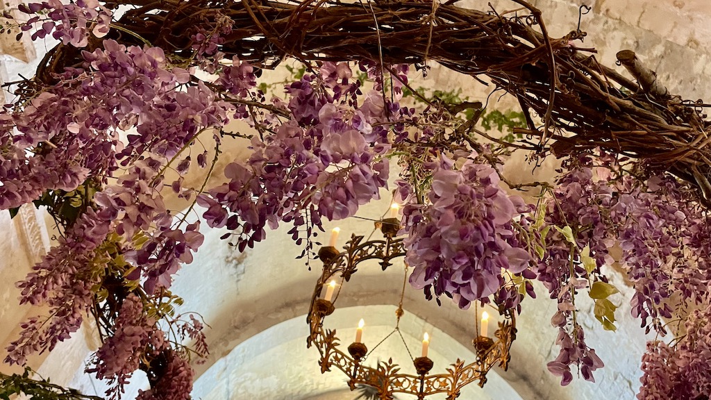 デコレーションは、実はキリストの物語の象徴で構成されていて、中央の冠はキリストの荊の冠を象徴するものに、フジの花が添えられています。キリストの流した血を象徴するのでしょうか。聖母マリアの涙なのかもしれません。いずれにしても息を呑むような美しい空間でした。