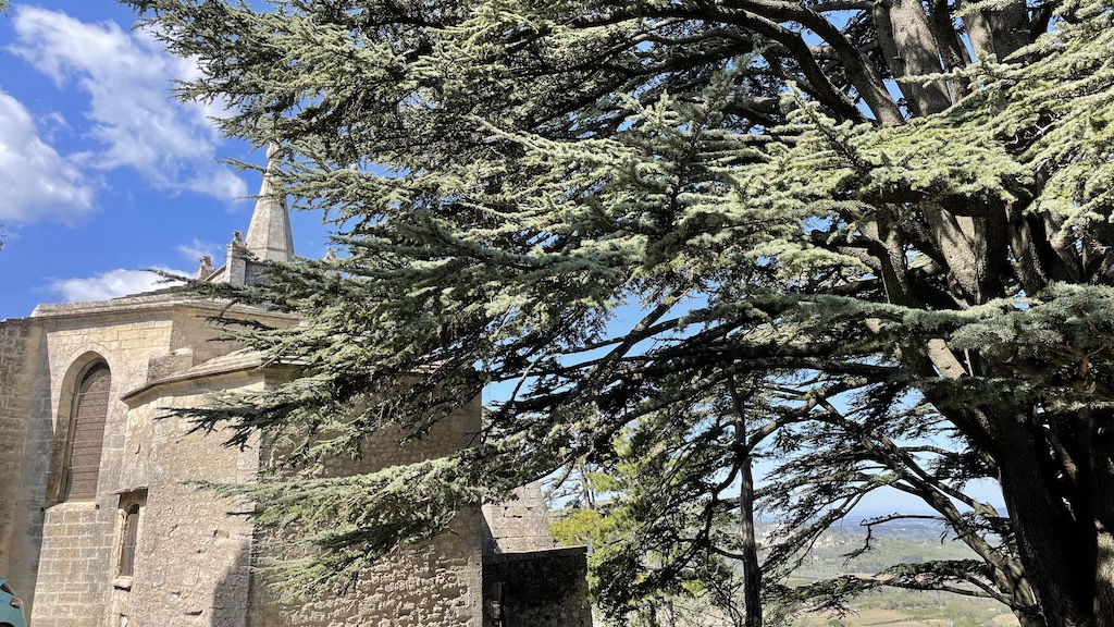 後ろ姿ですが、古い教会の建物の外観。大きなレバノン杉の枝間から、正面のラコスト村がよく見えます。