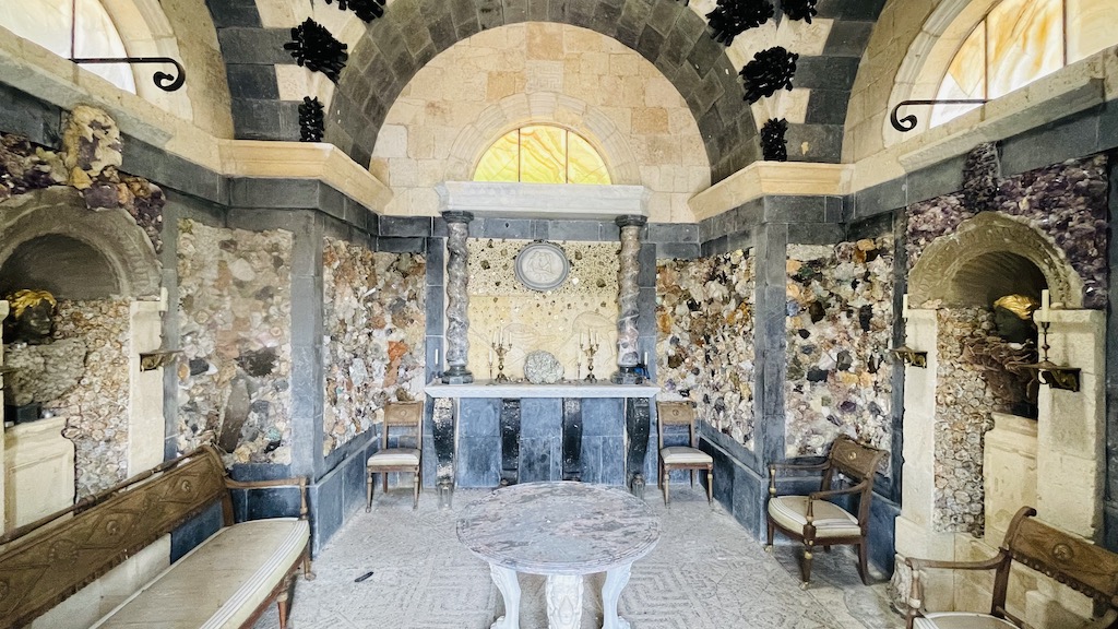 建物の内部も抜かりなく、驚異の部屋のような鉱物や石や貝殻で飾られたゴージャス空間。