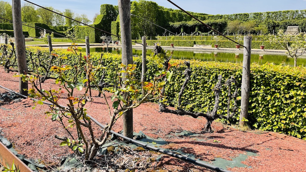 さて、長方形の池の側面には、ブドウ畑のように設えられています。これはイタリアというよりはちょっとフランスっぽいのかも。(オープンで日当たりが良い場所なので、ブドウ畑には最適です。)そして、それぞれのブドウの木の列の端には、バラが植えられています。この場所では装飾的意味合いが大きいと思いますが、実際の生産用のブドウ畑でも、バラは環境の変化や病気などにブドウよりも敏感に反応するので、ブドウの健康状態を測るためにバラが一緒に植えられていることがよくあります。