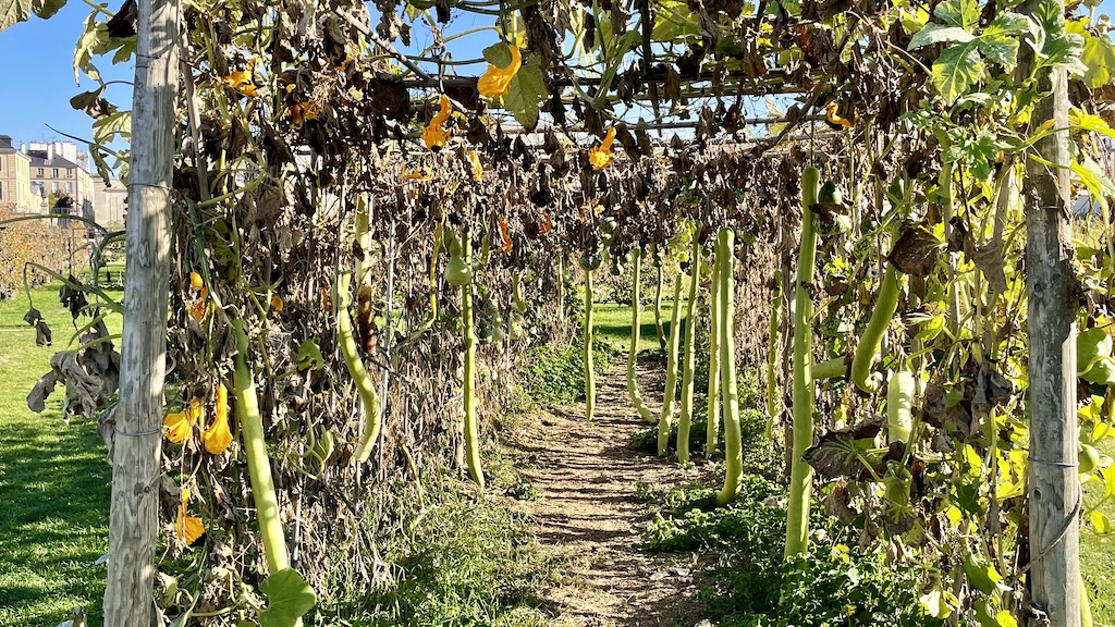 長ーいウリと瓢箪が合わさったパーゴラのトンネル。下を通るのもちょっと楽しい。