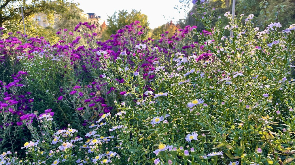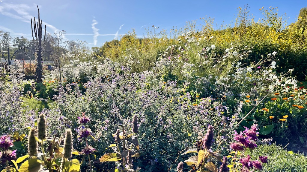 また、今年はポタジェでの夏のイベント時に設置されたガーデンカフェがそのまま残されたコーナーがいい感じです。コスモスやアスターの縁取りは素朴ながらも華やかで、気取らないポタジェの一角らしいエフォートレスな雰囲気が心地良い、今年のポタジェの一番のお気に入りの場所でした。