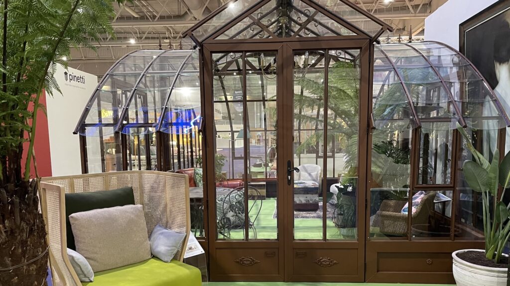 伝統的なトレイアージュが健在だったのには感動しましたが、温室(コンサバトリー)も売ってました。こちらも見た目のクラッシックさがチャームポイント。中は通常のリビングのように設られていて、植物栽培目的というよりは、ガーデンスペースをより快適に過ごそうという提案です。