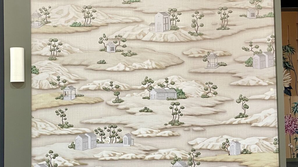 イギリスの壁紙ブランドの壁の一部。不思議な風景パターン。風景や植物紋様の壁紙の素敵なのがたくさんあったのですが、なんだか見るだけで満足してしまって、写真撮るのを忘れました(ゴメンなさい!)。絵画的な壁紙は、思い切ってダイニングやサロンなどに使っているのを見ると素敵だわあと思いつつ、すぐ飽きないかしら、などの心配もあるかもしれません。