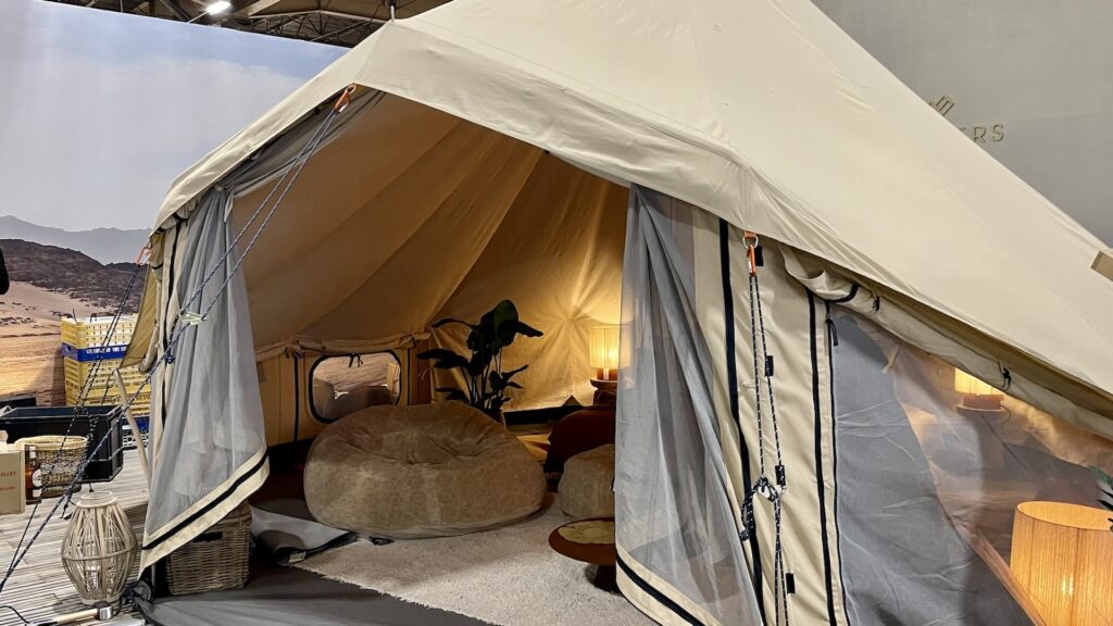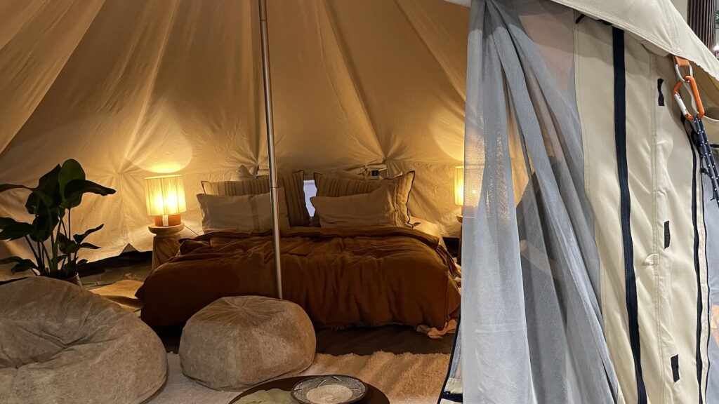 パオのような大きなテント、雰囲気はがっつりアウトドアというよりもシンプル&エレガントな感じがいい。