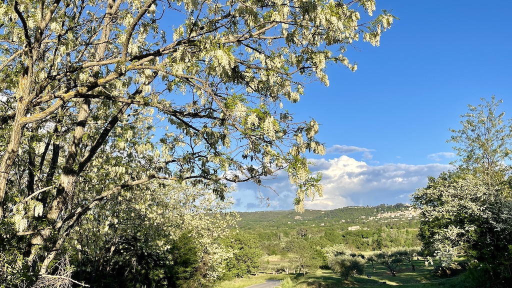5月のリュベロンの田舎道から。手前左は花満開のアカシアの木、その奥にエルダーやサンザシが続きます。右手奥は鷹巣型のボニューの村。