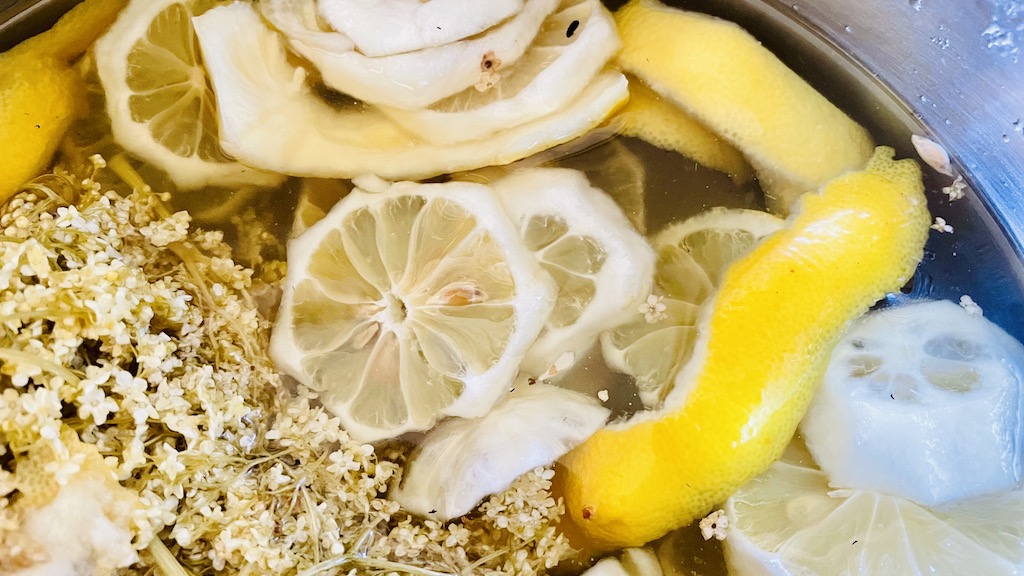 英国ハイクレア城に暮らす伯爵夫人がご指導くださるレシピで、特に変わった材料も必要なく、プロセスもごくシンプル。(レシピにあったクエン酸はすぐに見つからなかったので、レモン増量で対応しました。レモンはニース産の無農薬レモンです。)これで軽く2リットル以上のホームメイドのエルダフラワー・コーディアルが出来上がります。