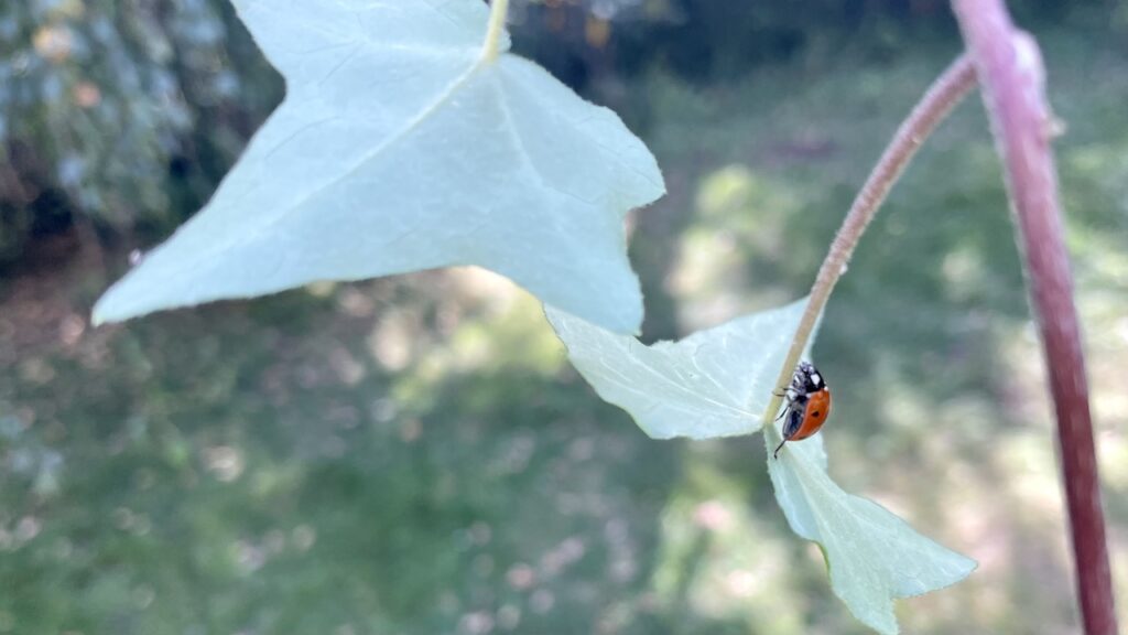本日の庭時間の締めくくりは、蔦にとまっていたてんとう虫くんで。