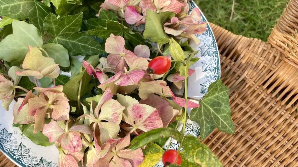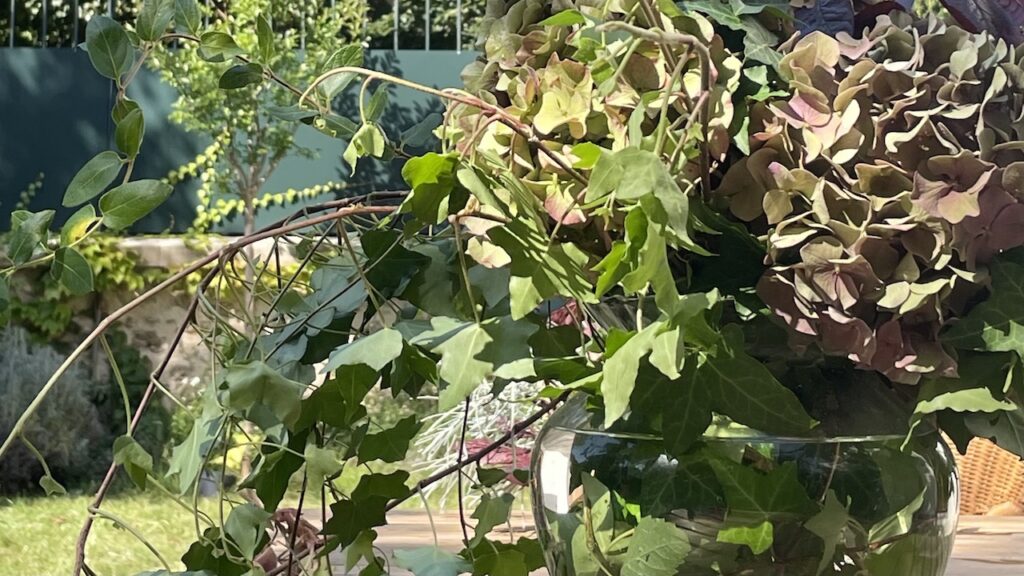 まず、庭の中で切っても良い花や緑を確認。秋の紫陽花が最盛期だったので、メインは色付き始めたアンティークカラーの紫陽花に。合わせる緑には、様々な低木類の若い枝がほぼ何でも使えるようです(棘や毒性には注意)。蔓延ってきて困るツタの蔓なども使い勝手の良い素材。剪定を兼ねてどんどん切っても、また直ぐ伸びてきますので心配ご無用。