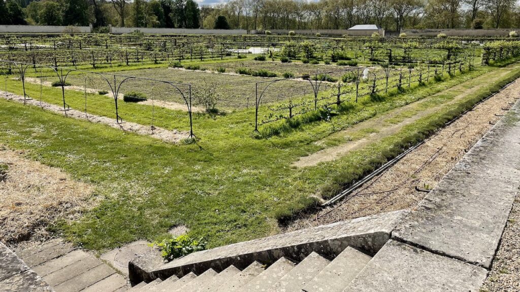 中央部分を超えて、さらに進んでいくと、その先の果樹園も階段で降りる沈床式庭園になっています。