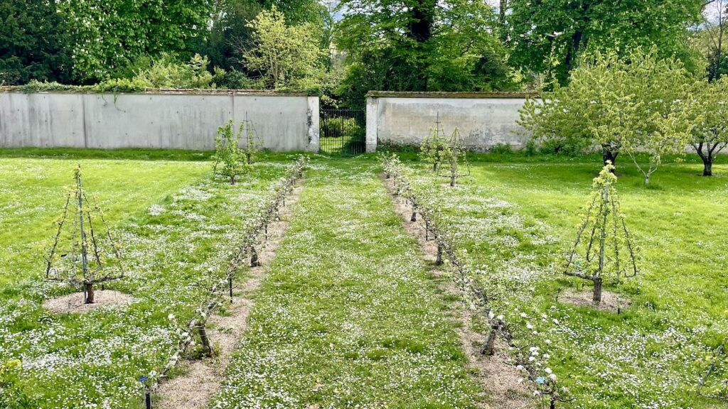 パクレットと呼ばれる雛菊がいっぱいに咲き、フレッシュなグリーンと白が混じる芝生と、白っぽいリンゴの花のポタジェの春風景。本格的な春を感じる、気持ちがすっかり明るくなる風景です。