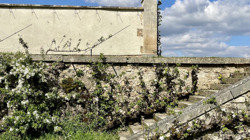 庭園の主要な壁は痛みが激しかったため、近年修復工事が行われたところです。元来石灰や石を使って作られていた壁に、その後セメントなどを用いた修復が加わった結果、異素材が上手く馴染まずに却って亀裂や痛みの原因になるなどの経緯を経て、今回はすっかり綺麗に修復されて、再び果樹が定植されるのを待つ壁部分。